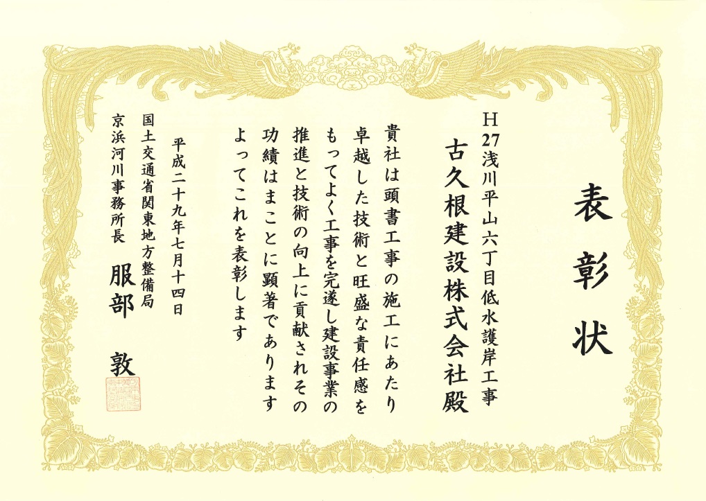 同じく国土交通省関東地方整備局より、弊社が施工いたしましたH27浅川平山六丁目低水護岸工事の優秀工事技術者として、谷藤工事課長が表彰されました。
